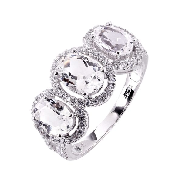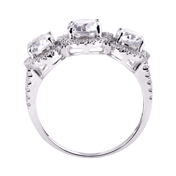 Cette somptueuse bague est empreinte d’un esprit romantique intemporel Elle est rehaussée d’ une trilogie de cristal, entourée d’oxydes de zirconium. Affichant une merveilleuse élégance, elle fera un cadeau apprécié