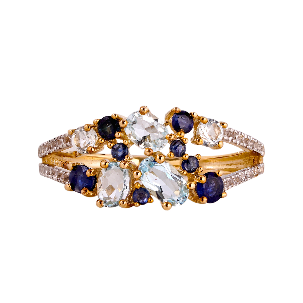 Optez pour l’originalité de cette bague. En or jaune elle est surmontée d’une constellation de saphirs et de topaze !i Elle deviendra rapidement un accessoire favori de votre boite à bijoux.