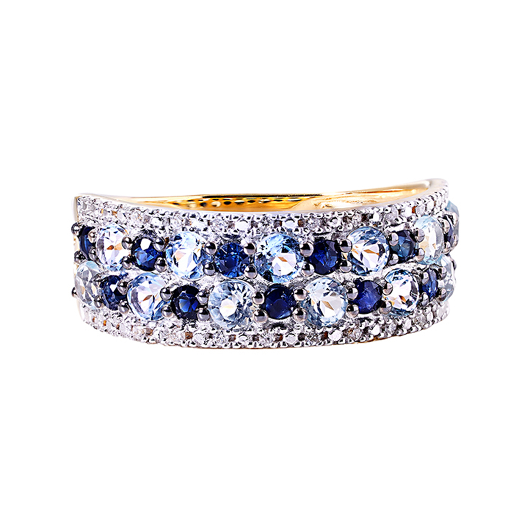 Apportez une touche glam’ rock à tous vos looks et optez pour cette bague tendance en or jaune 750 millièmes sertie de saphir, topaze et diamants..Craquez pour son volume et la brillance des pierres. C’est la bague idéale pour se démarquer avec style. Ré