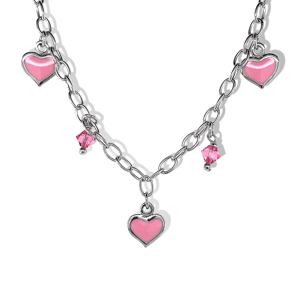 Succombez au charme de ce collier en argent pour enfant orné de pampilles cœur en laque rose ! Succès garanti auprès des petites filles !